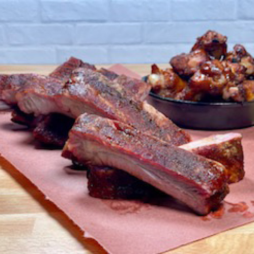 The wings were seasoned with my homemade barbecue rub and left to air-dry in the refrigerator for a few hours. While the wings set-up in the refrigerator I prepared the ribs. I started by removing the membrane from the back of the ribs. I lightly rubbed the ribs with yellow mustard as a binder to help the rub stick. Next, I generously seasoned the ribs with my homemade barbecue rub. I set-up my Big Green Egg XL (BGE) for indirect grilling and heated it to 250 degrees. I added a few wood chunks to create wood smoke. The ribs smoked at 250 degrees for one and half hours. Now that the ribs had developed a nice bark, it was time to sauce the ribs.