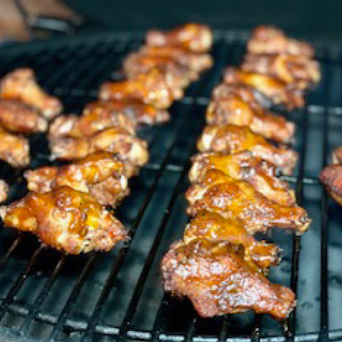 To cook the wings I increased the temperature of the BGE to 400 degrees. The wings smoke-roasted for 25 minutes and then I sprayed them with a combination of apple cider vinegar and barbecue sauce. The wings went for fifteen more minutes. Once the wings started to crisp up, I painted them with warm barbecue sauce. Once the wings were glazed and sticky, I removed the wings from the BGE. I added the sauce at the end, so the sauce does not burn on the wings.