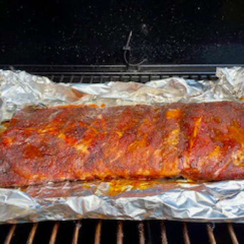 I basted the ribs with warmed sauce and wrapped the ribs in aluminum foil, and they went for another forty-five minutes. I opened the foil and opened the vents on the BGE to achieve a temperature of 375 degrees to caramelize the sauce on the ribs. I loosely rewrapped the ribs in the foil and let them rest while the wings cooked.