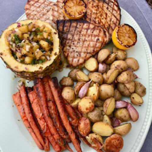 I basted the swordfish one more time before serving. I garnished it with grilled lemons to squeeze over the swordfish. I served the swordfish family style with grilled pineapple salsa, roasted carrots, and roasted potatoes. The high heat of the wood fire created a lightly crisp exterior on the swordfish, while maintaining a juicy inside. The basting mixture provides a blast of richness from the butter and freshness from the lemon and parsley. The salsa is sweet and provides contrast in texture from the swordfish. Enjoy!