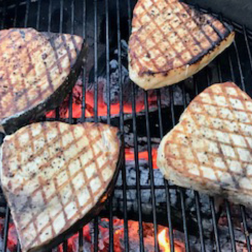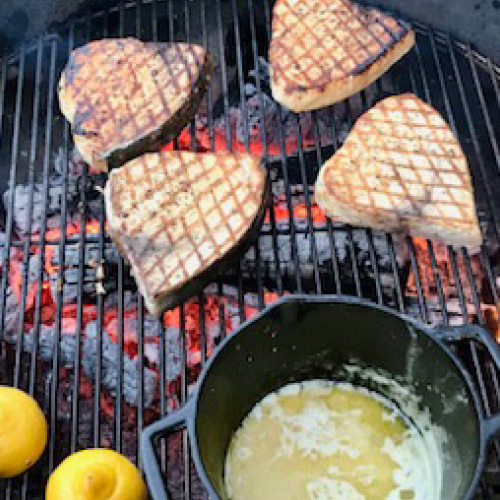 I set up a 2-zone wood fire in the kettle grill to cook the swordfish. The 2-zone fire allows me to move the swordfish to cool zone away from the fire in case there are flare-ups, and this keeps the fish from burning. I oiled the grill grate to keep the fish from sticking. The key to cooking fish over a hot grill is to leave it alone and move it once it releases on its own. To create the wood fire a lite a bag of wood chucks in a chimney starter instead of charcoal.