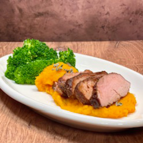 I roasted the butternut squash until they were fork-tender. I had two large butternut squash, so they roasted for close to an hour. I scooped out the squash while it was still hot since it is easier. The butternut squashes were so big I was able to get at least two cups of squash per half for a total of about 8-9 cups. Feel free to adjust or skip the next few steps based on the amount of squash. I mashed the squash with a half a stick of butter, ¼ cup of sour cream, half a teaspoon of cinnamon and Kosher salt. I did not add it, but a pinch of nutmeg would pair well with the butternut squash. Or sprinkle more of the spice rub into the butternut squash. Finally, I julienned four sage leaves and added it to the butternut squash. I served the butternut squash with pork tenderloin and broccoli. Enjoy!