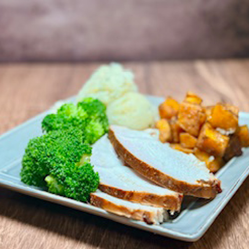 I sliced the turkey breast off the bone. Leaving the bone attached while cooking helps the turkey breast to retain its shape. The turkey breast had a flavorful exterior due to the barbecue rub. The inside was tender, juicy, and tasty due to the brine and the resting process. It was far from dry or bland. I served the sliced turkey breast with mashed potatoes, spice rubbed roasted butternut squash, and broccoli. Enjoy!